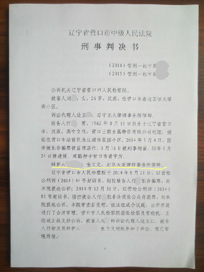张立文律师成功办理营口中院审理的付某诈骗案。